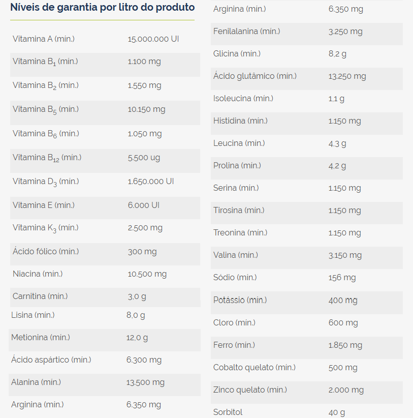 COMPOSIÇÃO BÁSICA DO PRODUTO: Acetato de retinol (vitamina A), mononitrato de tiamina (vitamina B1), riboflavina (vitamina B2), D-pantotenato de cálcio (vitamina B5), cloridrato de piridoxina (vitamina B6), cianocobalamina (vitamina B12), colecalciferol (vitamina D3), acetato de DL-alfa-tocoferol (vitamina E), menadiona bissulfito de sódio (vitamina K3), ácido fólico (vitamina B9), niacina (ácido nicotínico, vitamina B3), L-carnitina, L-lisina HCl, DL-metionina, L-ácido aspártico, alanina, L-arginina, fenilalanina, glicina, L-ácido glutâmico, isoleucina, histidina, L-leucina, prolina, serina, tirosina, L-treonina, L-valina, cloreto de sódio, cloreto de potássio, ferro aminoácido quelato, cobalto aminoácido quelato, zinco aminoácido quelato, sorbitol, aroma de baunilha, sacarina sódica anidra, sorbato de potássio, benzoato de sódio, propilenoglicol, goma xantana e água.