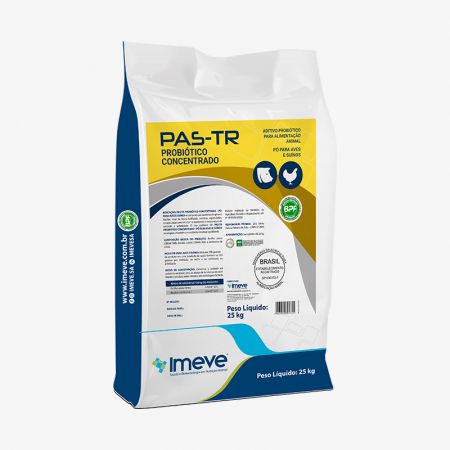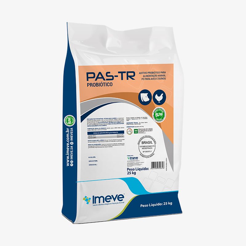 PAS-TR PROBIÓTICO - PÓ PARA AVES E SUÍNOS é composto por bactérias do gênero Bacillus, vivas na forma liofilizada, aeróbias, esporuladas, encapsuladas com íons Ca++ e resistentes à temperatura de extrusão e peletização. O uso contínuo do produto contribui para o equilíbrio da microbiota intestinal. PARA USO EXCLUSIVO DE FABRICANTES DE ALIMENTOS PARA ANIMAIS.